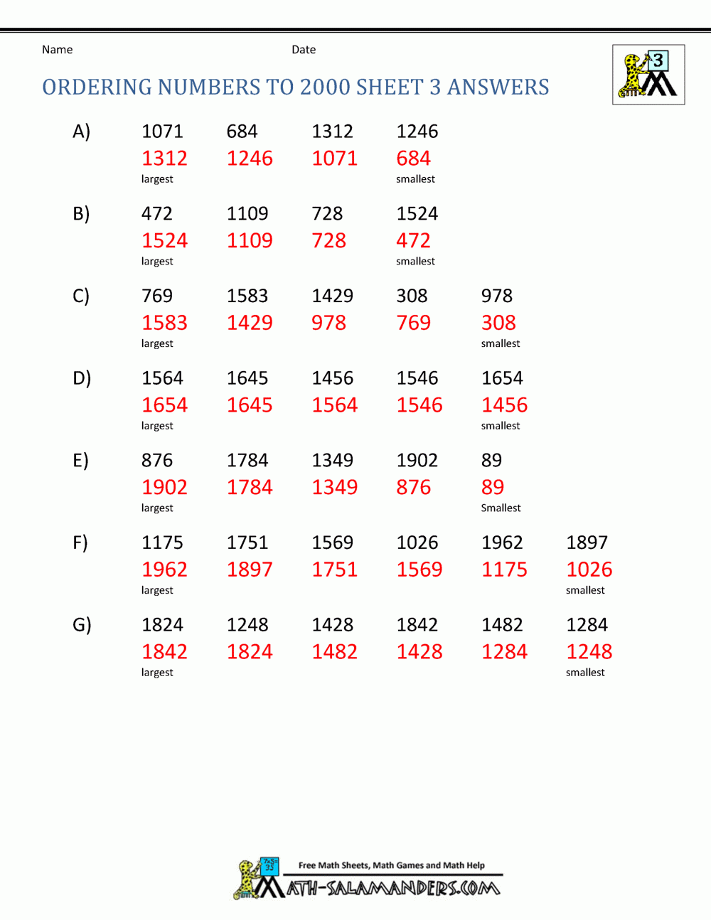 Ordering 4 Digit Numbers Worksheets 3rd Grade