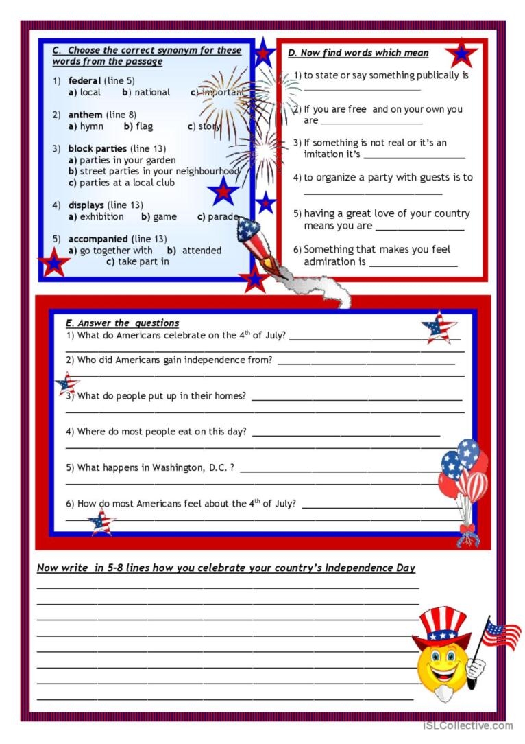 Independence Day 4 July READING COMPREHENSION 2PAGES ESL Worksheet By Zizou27300