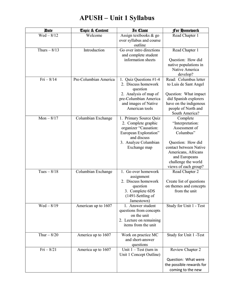 APUSH Unit 1 Syllabus Pre Columbian America To 1607