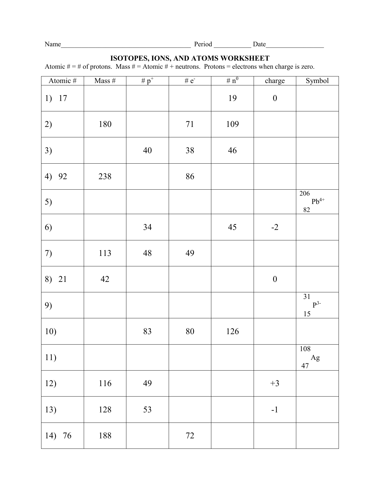 The atoms isotopes and ions worksheet typically includes a variety of questions and problems related to atoms, isotopes, and ions. You may be asked to identify different elements on the periodic table, calculate the number of protons, neutrons, and electrons in an atom, or determine the charge of an ion.