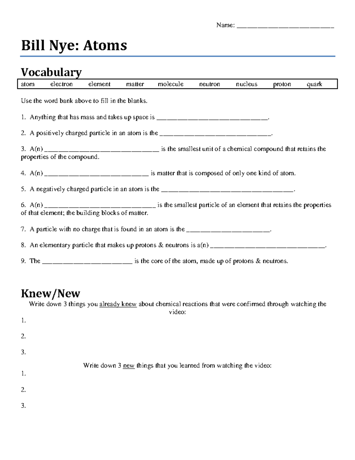 bill nye atoms and molecules worksheet