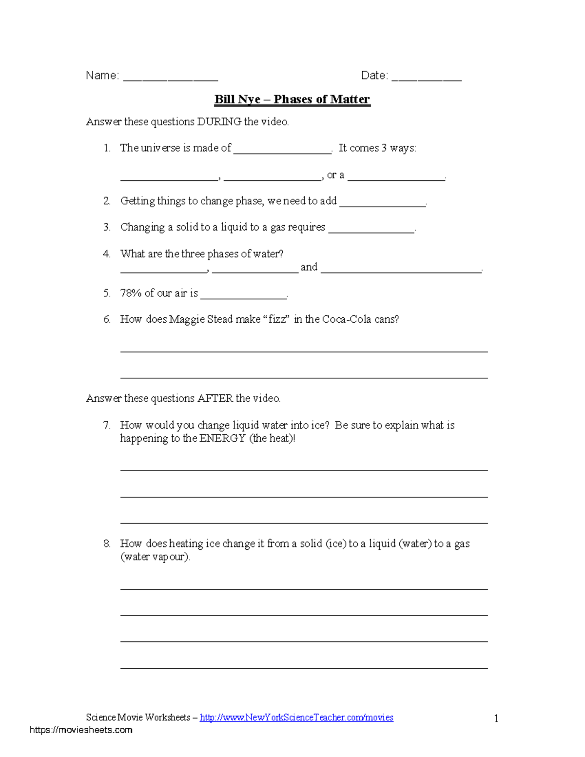 Bill Nye Atoms Worksheet Matter Atoms Molecules