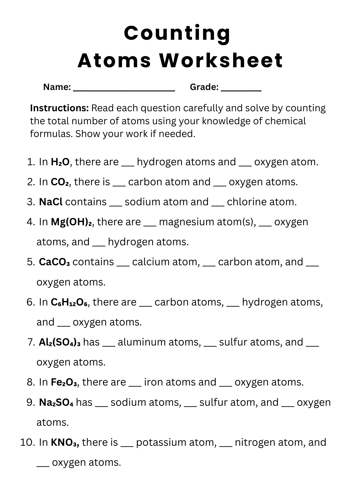 Whether you’re a student studying for an exam or a teacher looking for extra resources for your students, counting atoms worksheets can be a valuable asset. They offer a hands-on approach to learning about atoms, molecules, and chemical reactions, making abstract concepts more concrete and easier to grasp.