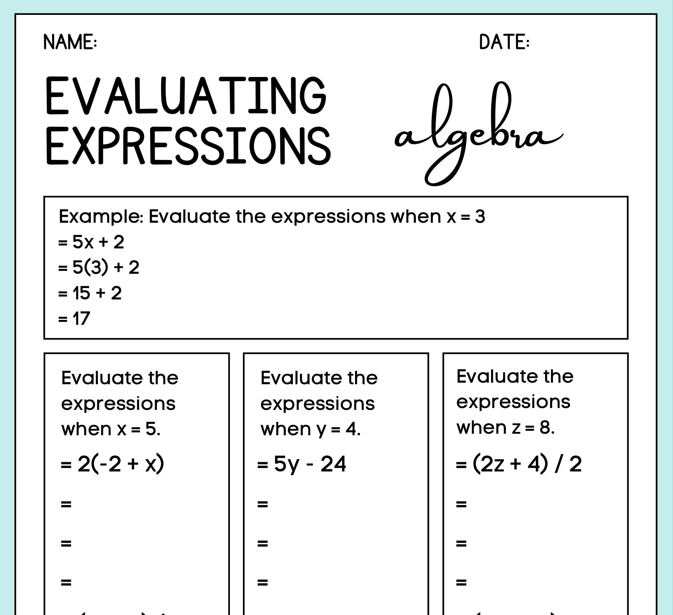 Evaluating Expressions Worksheet Etsy