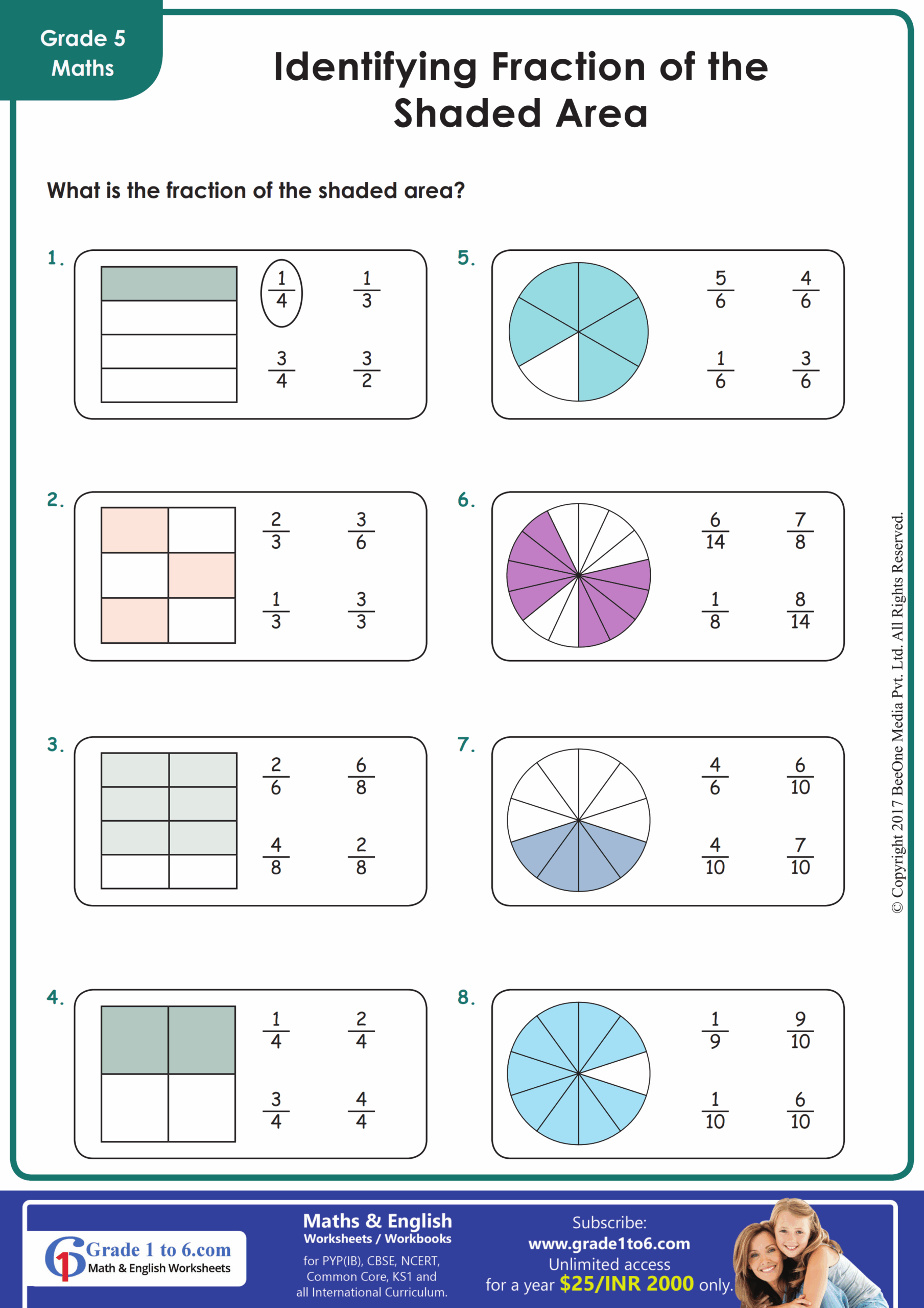 Fraction Of Shaded Area Worksheets Grade1to6