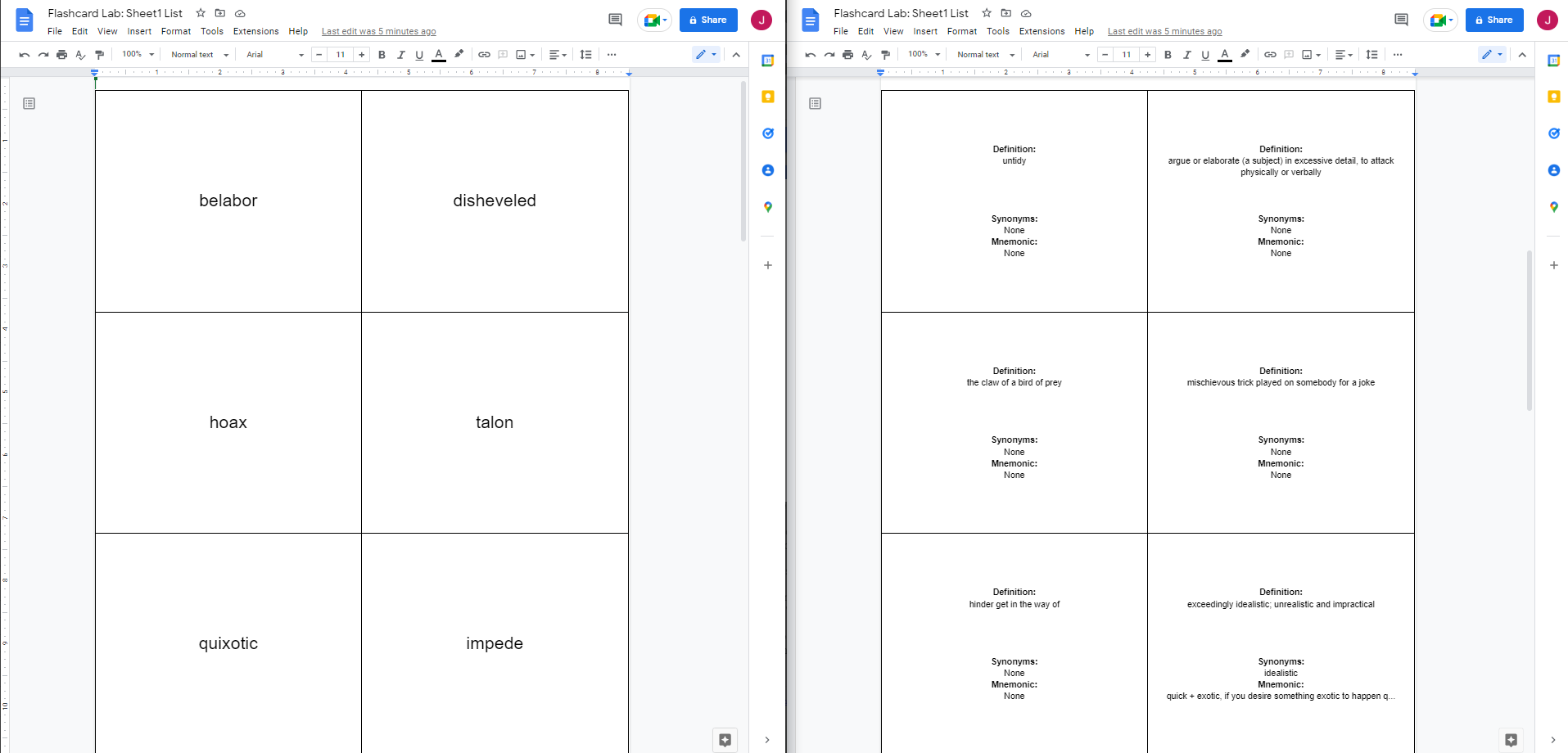 google docs flashcard template