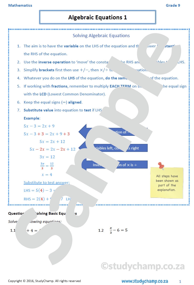 Grade 9 Mathematics Worksheet Algebraic Equations