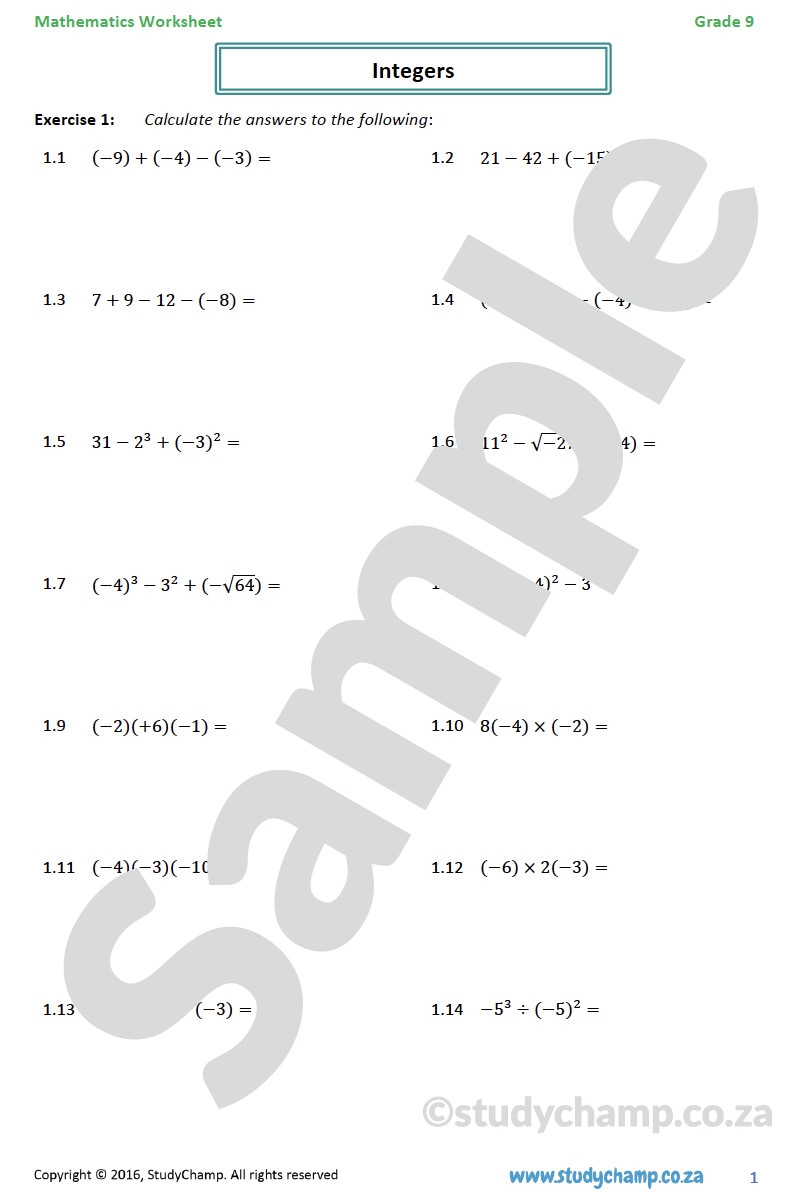Grade 9 Mathematics Worksheet Integers
