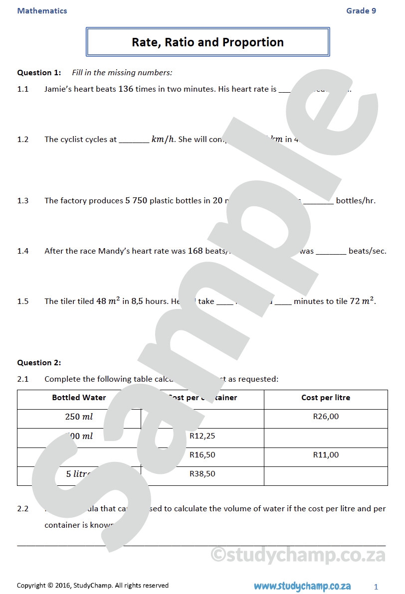 Grade 9 Mathematics Worksheet Rate Ratio And Proportion