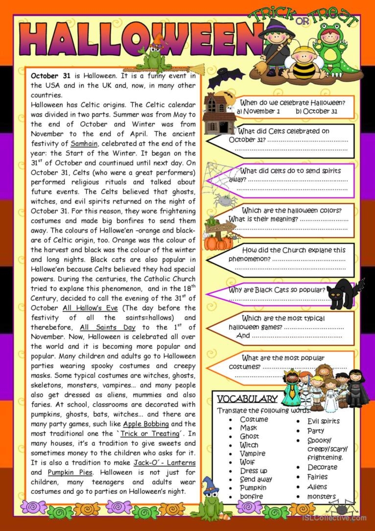 Halloween History Reading Comprehension Vocabulary Grammar 2 Pages fully Editable ESL Worksheet By Zailda