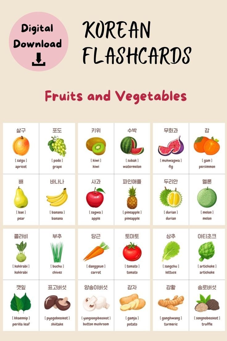 Korean Flashcards With Fruits Vegetables Learning Korean Basic Vocabulary Korean Word Cards