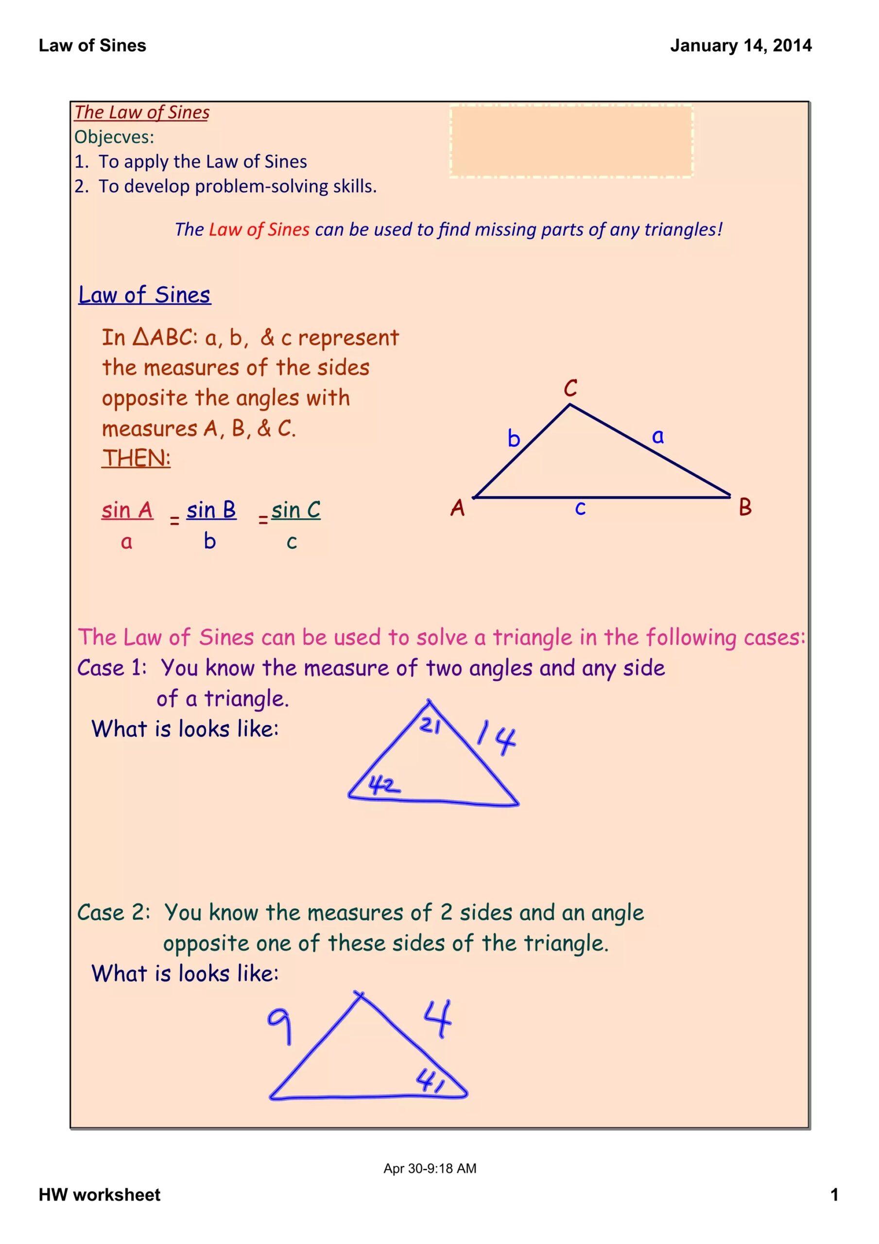 Law Of Sines Worksheet