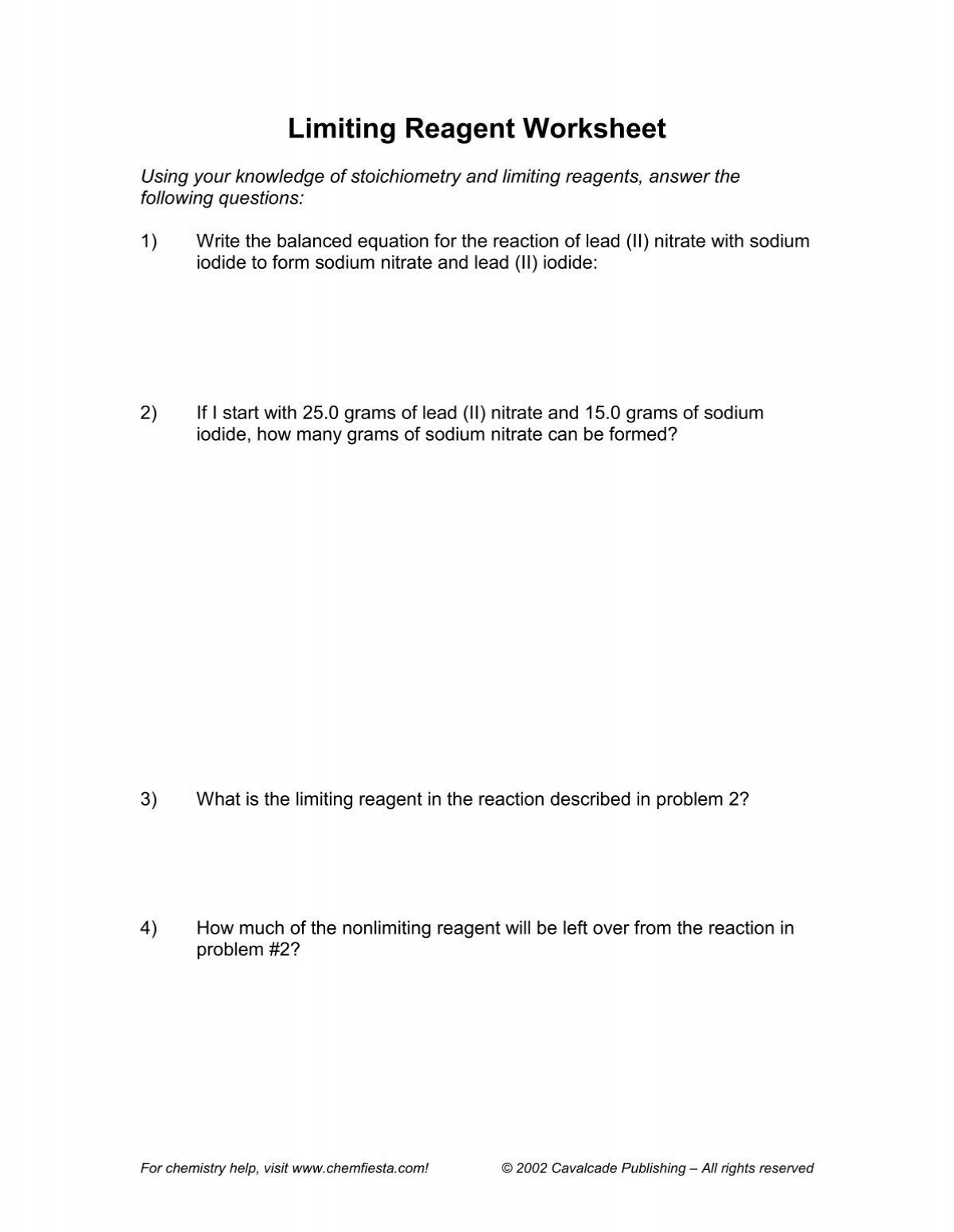 When working with chemical reactions, it’s essential to identify the limiting reagent. This is the reactant that determines how much product can be formed. By completing a limiting reagent worksheet, you can practice solving problems and gain confidence in your abilities.