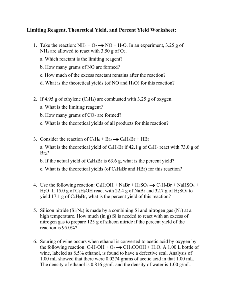Limiting Reagent Yield Worksheet Chemistry Problems