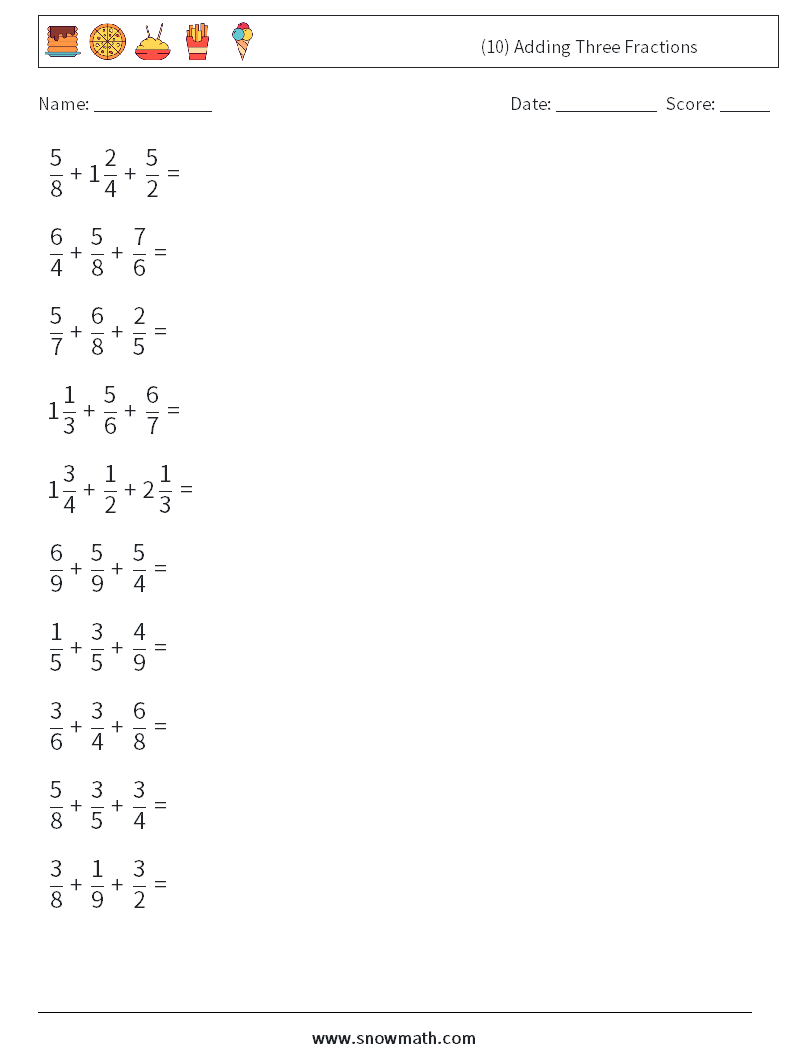 10 Adding Three Fractions Math Worksheets Math Practice For Kids