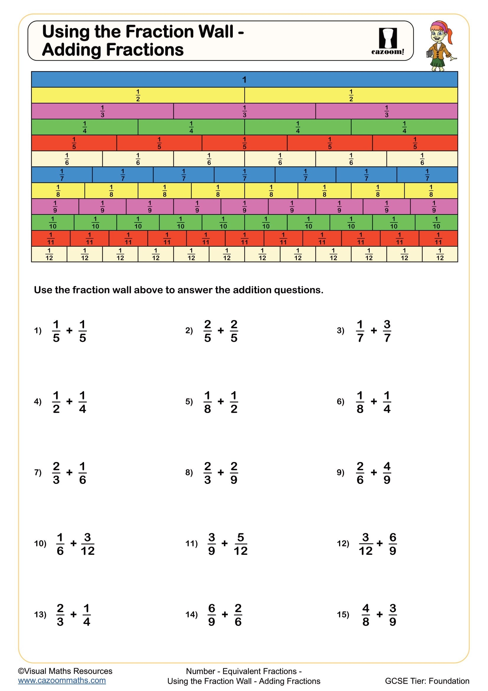 Using The Fraction Wall Adding Fractions Printable PDF Year 7 And 8 Number Worksheet