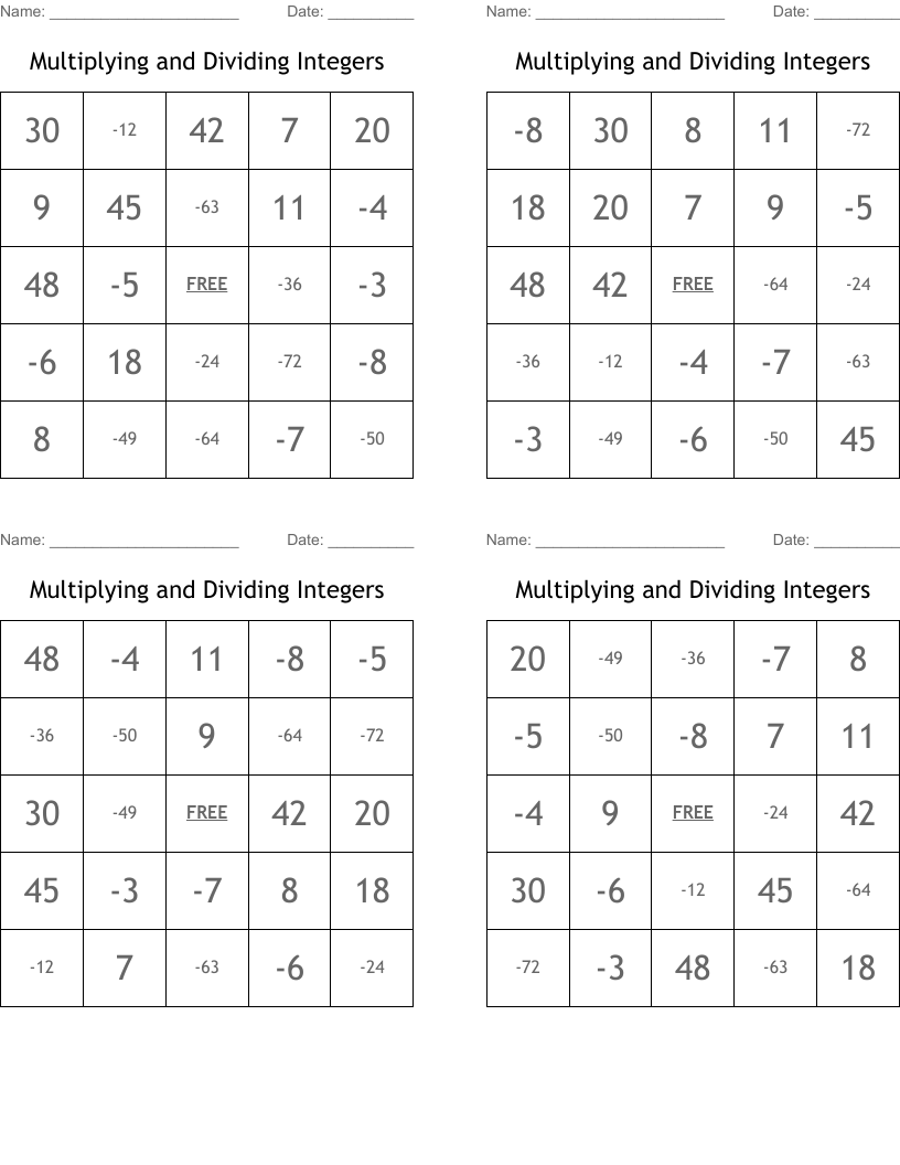 Multiplying And Dividing Integers Bingo Cards WordMint