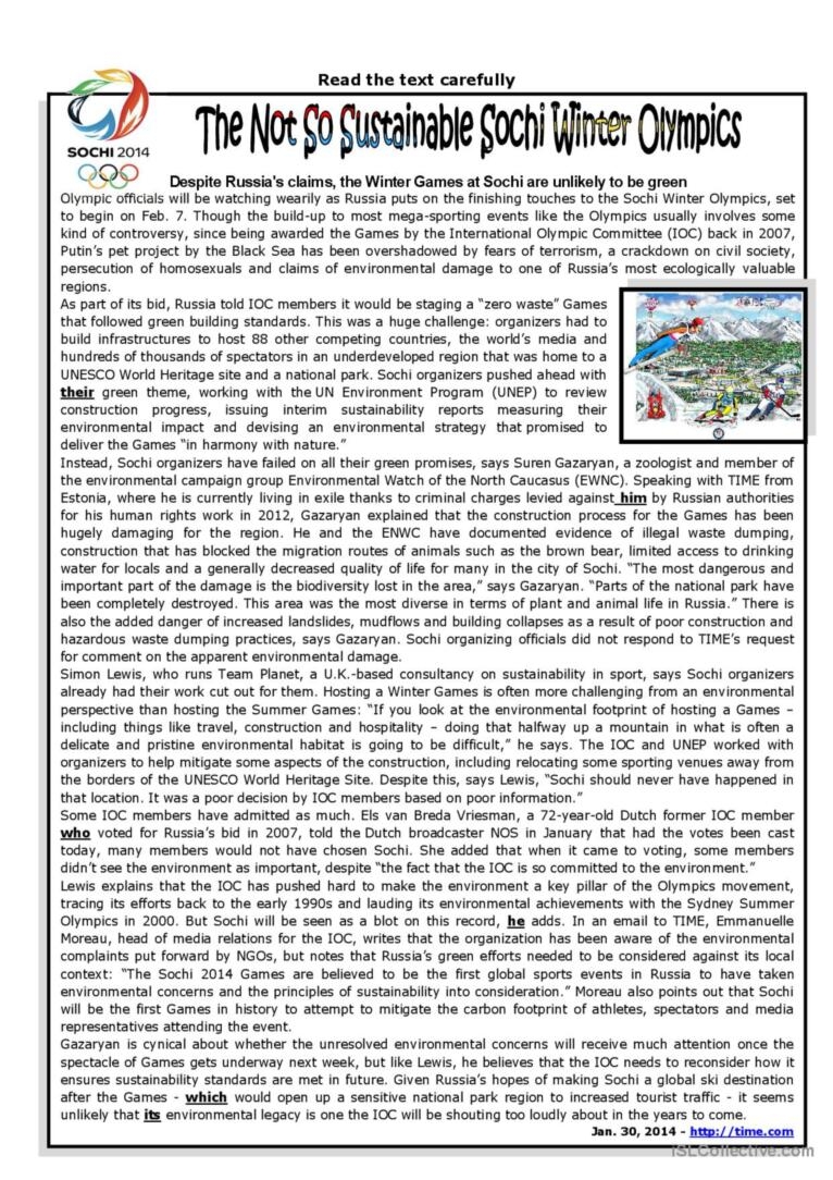 The Not So Sustainable Sochi Winter English ESL Worksheets Pdf Doc