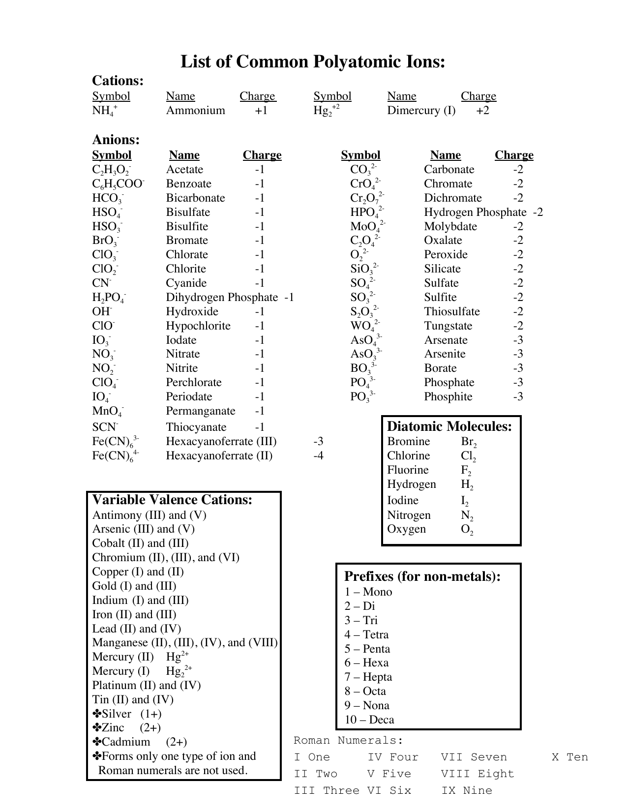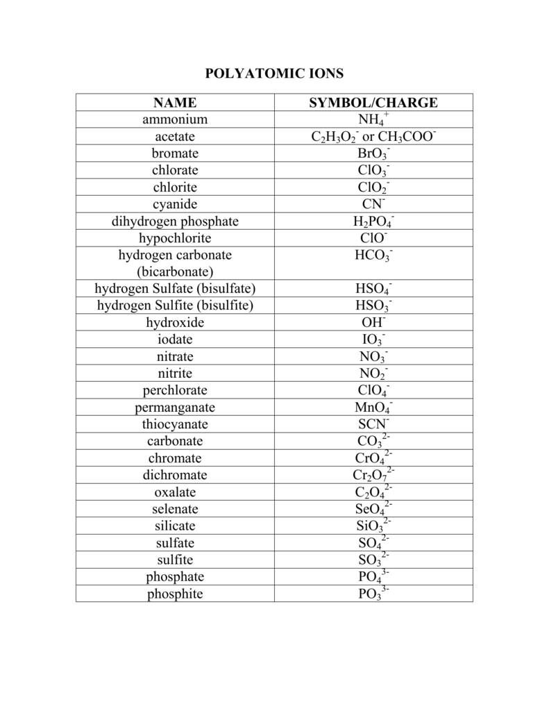 Polyatomic Ions Reference Sheet