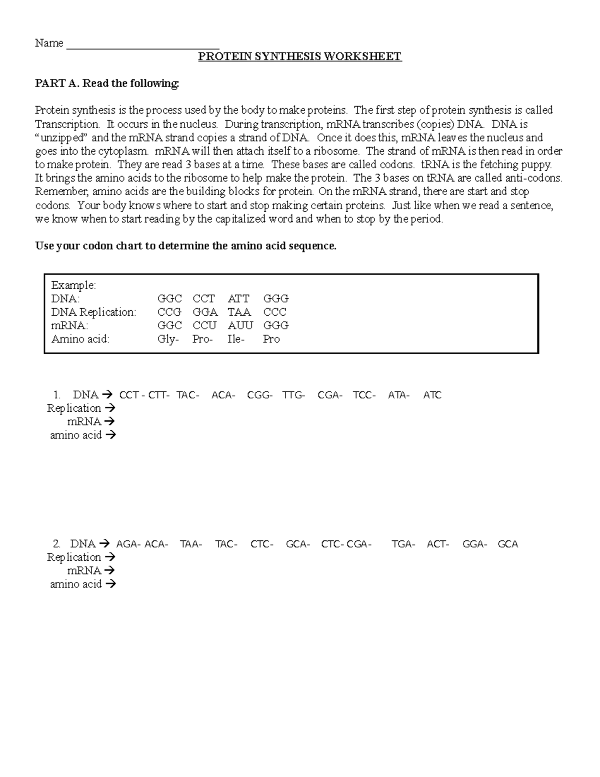 Protein Synthesis Worksheet Part A: Read the Following