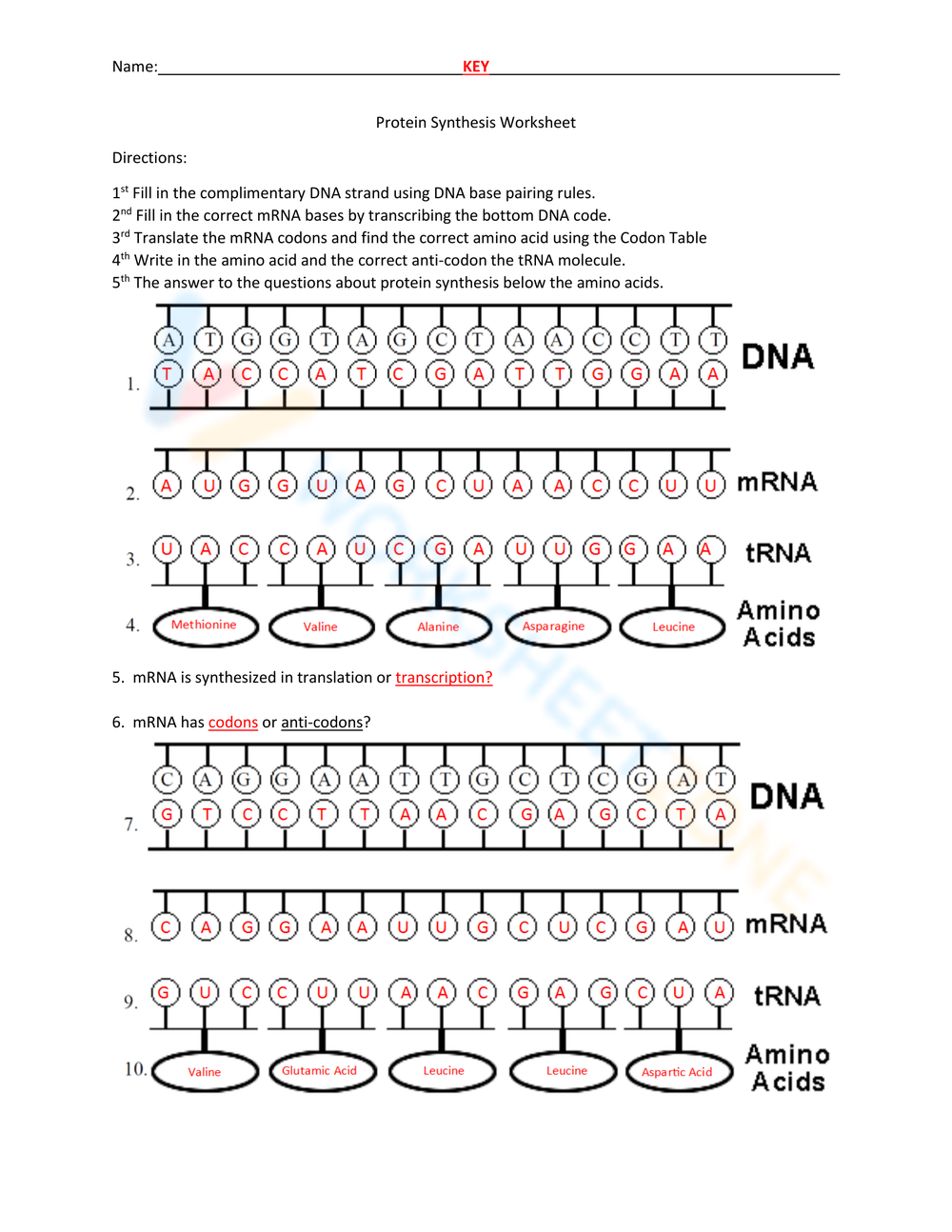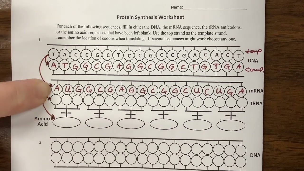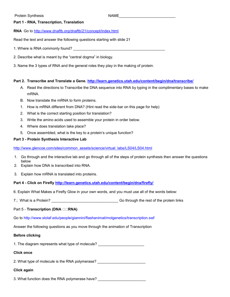 Protein Synthesis Worksheet RNA Transcription Translation