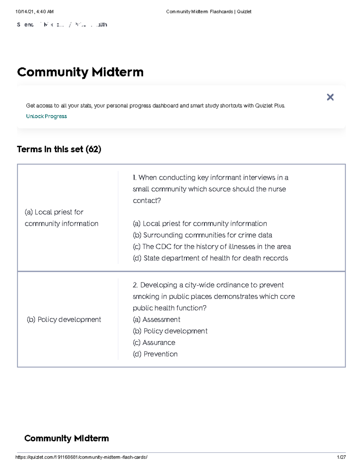 Community Midterm Flashcards Quizlet Community Midterm Science Medicine Public Health Terms In Studocu
