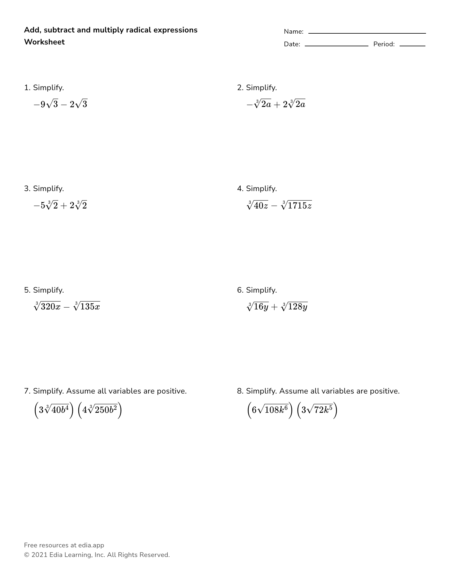 Radical expressions involve square roots, cube roots, and other roots that can be tricky to simplify. However, with practice and understanding the rules, you can simplify them like a pro. Our worksheet will walk you through various examples and provide step-by-step solutions to help you grasp the concept.