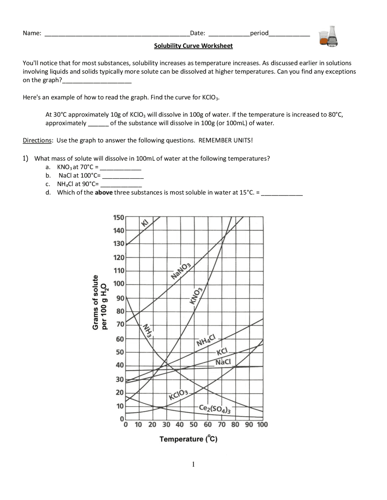 Solubility Curve Practice Problems Worksheet 1 Directions Find The Mass Of Solute Will Dissolve In 100mL
