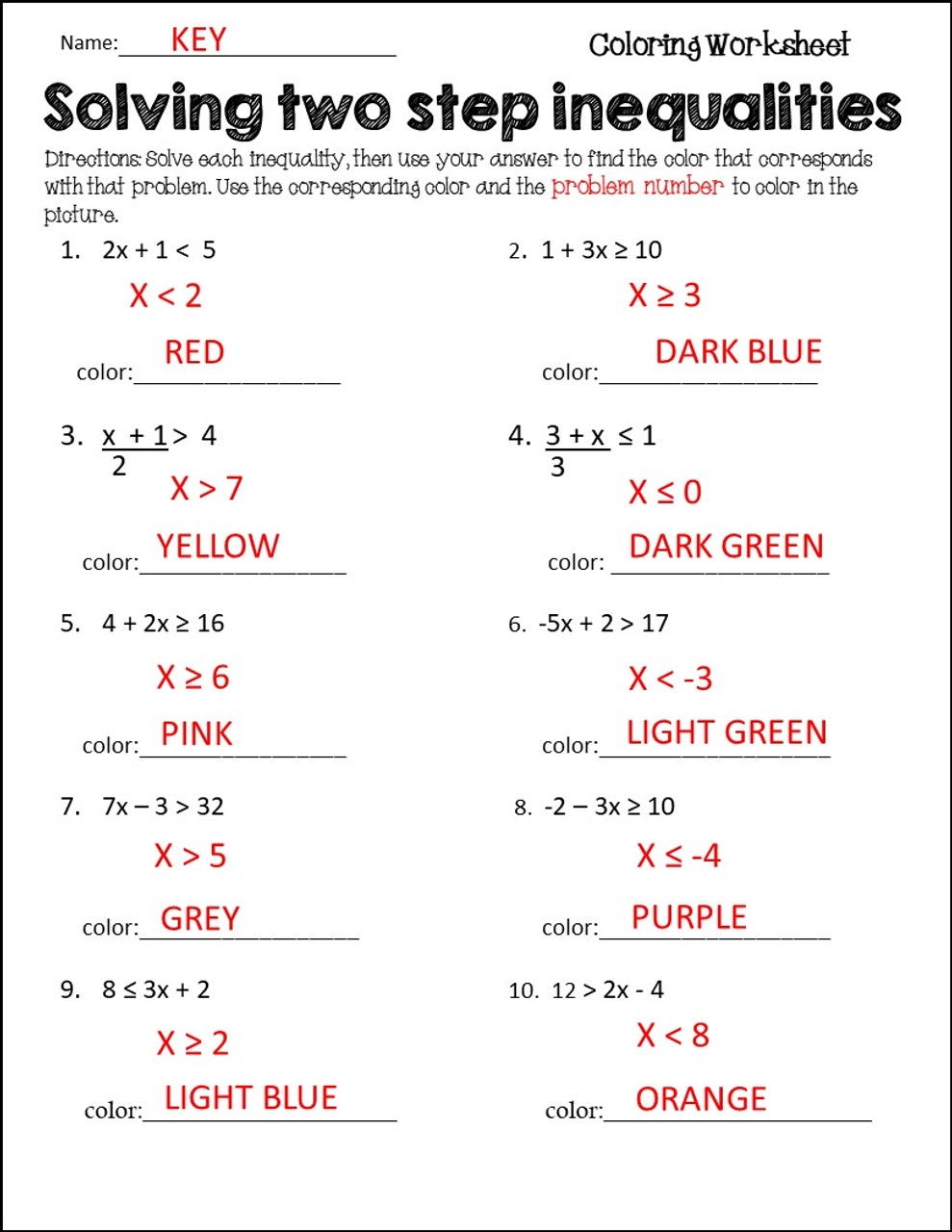 Two Step Inequalities Coloring Worksheet Worksheets Library