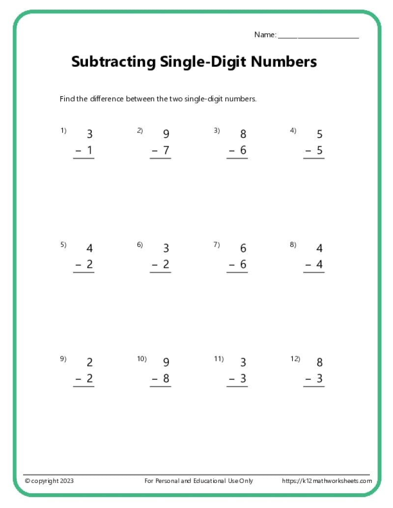 Single Digit Subtraction Worksheets K12 Math Worksheets