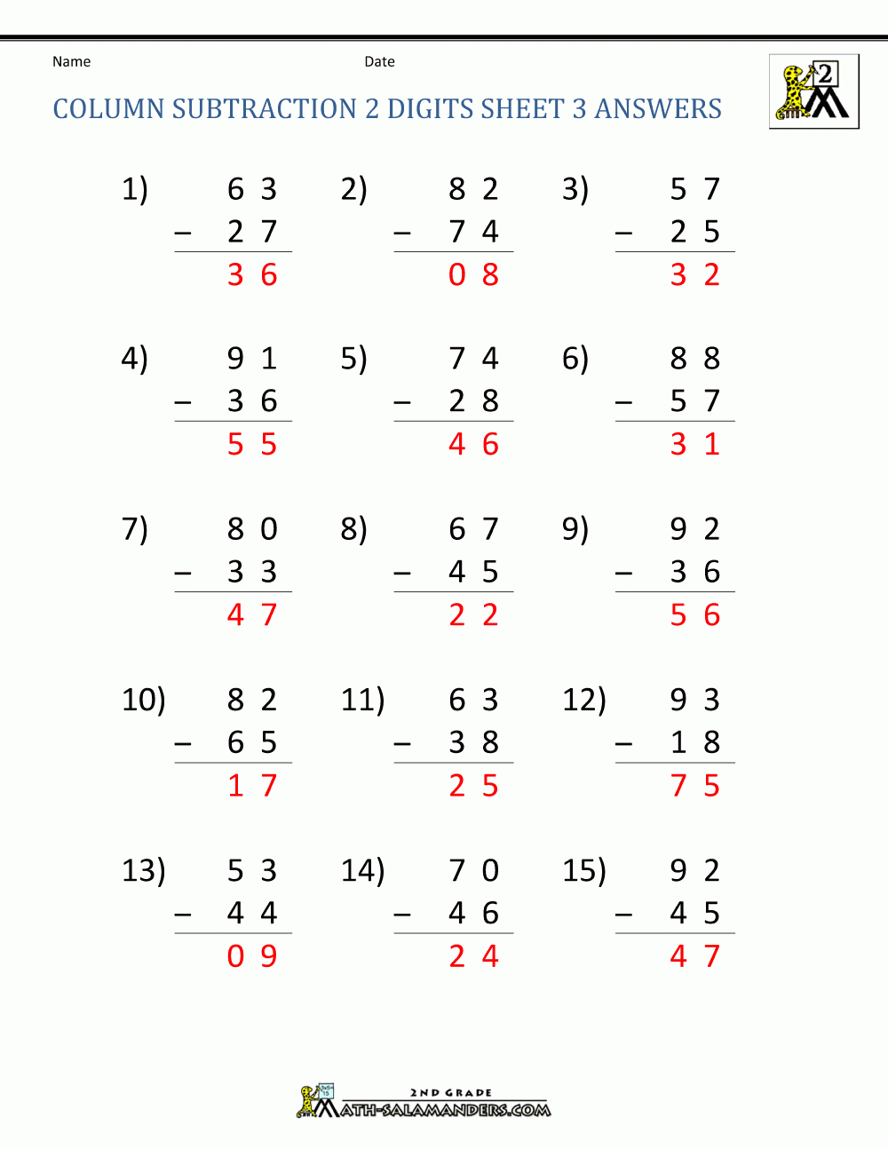 2 Digit Subtraction Worksheets